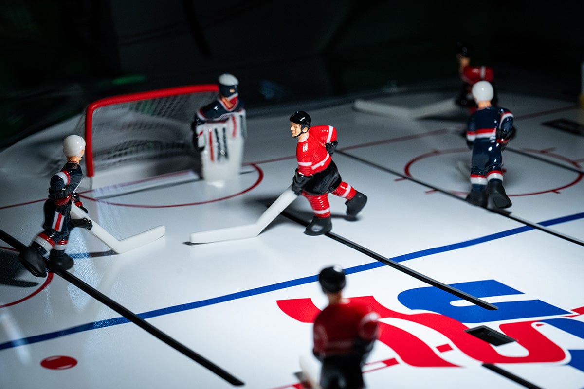Limited edition "USA vs CANADA" SUPER CHEXX PRO® comes with custom hand-painted USA vs. CCCP jerseys. This game also includes the limited "USA" or "CANADA" custom ice surface.